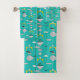 toalla de baño de bonito con un toque de color turquesa de los años 50. Geométrico, ovalado, boomerang, formas abstractas en negro, blanco y amarillo.