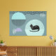 Círculos abstractos y arcos con gato negro moreno. Colores crema, azul polvoriento, violeta y negro.