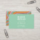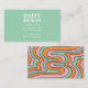 Una tarjeta de visita de estilo abstracto estilo años 70 con un estilo burgués y llamativo, con líneas onduladas abstractas y un estilo retro chunco para tu nombre. Colorido y atrevido en tonos azul verde, naranja, rosa.