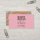 Una tarjeta de visita de estilo abstracto estilo años 70 con un estilo burgués y llamativo, con líneas onduladas abstractas y un estilo retro chunco para tu nombre. Sólido rosa en el frente con colorido y atrevido en tonos verde azul, naranja, rosa en la parte posterior.