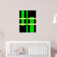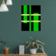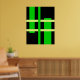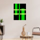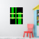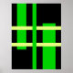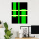 Un minimalista diseño de arte geométrico abstracto de líneas y bloques de colores verdes y amarillos sobre un fondo negro.