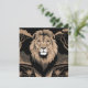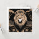 Este diseño presenta un retrato vintage de león, con un ilustracion vintage de un retrato de un león de apariencia tranquila y superior. El fondo es un paisaje de safari blanco y negro con árboles y montañas. La imagen general tiene un estilo art decó.