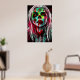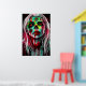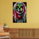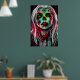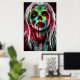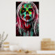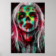 Retrato de una colorida cara de una mujer zombie con el pelo largo, mayormente blanco. Este es un arte generado por IA.