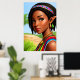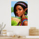 Retrato de una joven mujer, híbrida de elfos humanos con piel negra, pelo corto negro y vestido colorido. (Medio humano, medio elfo). Este es un arte generado por IA.