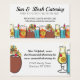 Bebidas retro, exóticas o tropicales, tarjetas de negocios con rodajas de fruta, fruta en palos y paraguas en un coco para una buena medida. Diversión, bebidas coloridas para los planificadores fiestas, empresa de restauración o de comercios.
