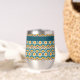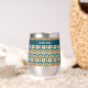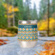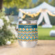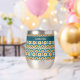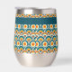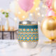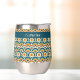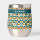 Esta copa de vaso de vino tiene un colorido estilo bohemio de círculos azules, naranjas y amarillos. Su nombre, monograma u otro texto está en amarillo pálido en un borde superior azul verde azulado. ¡Estilo retro!