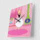 Este Reloj Retro en la pared acrílica rosada parece una escena de una comedia romántica de los años 60. El diseño minimalista muestra a una mujer sofisticada en su apartamento de ático ultra kitsch y ultra rosa. La habitación está decorada con una pared de ladrillo rosa con líneas de gruta blanca. Delante de la pared hay una chimenea de cono verde con una gran chimenea. A través de las puertas correderas de cristal se ve un balcón rosado con barandilla blanca. Una planta tropical exuberante se encuentra en una maceta de flores acuáticas. Las vistas desde el balcón son a una silueta de un horizonte urbano. Por supuesto, la silueta es rosa. Una luna amarilla y creciente está en el cielo. Sobre una alfombra rosada caliente, la principal dama de este diseño es el apartamento. En marcado contraste con el mundo rosado que ha creado, la hermosa rubia está usando una cubierta de forma, negra, de cuello de cuchara, con una larga falda blanca y con estampados de plumas negras. Con este diseño, usted también puede estar mirando el mundo a través de gafas de color rosa!