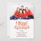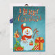 Un muñeco de nieve alegre con paquetes de regalo envueltos en colores brillantes a su lado le desea a todos una Feliz Navidad al frente de esta tarjeta de plantilla de fotos de Holiday. El muñeco de nieve usa un sombrero de Santa y una bufanda roja, y sostiene un bastón de dulce. Las imágenes brillantes se colocan sobre un fondo verde azulado degradado. La parte posterior de la tarjeta contiene su propia fotografía, repite el saludo y tiene 3 plantillas de texto para su propio mensaje.