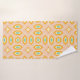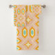 Retro geometric pattern with hexagons and stars in blue, orange, and yellow on a light pink background. The design feels vibrant and nostalgic.