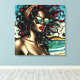 Bonito retro mujer afroamericana en bikini sentada en la playa con gafas de sol en colores vintage al estilo de un cómic de arte pop.