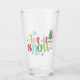 Este divertido vaso de agua muestra el dicho "déjalo nevar" con colores alternos en letras minúsculas con acentos brillantes. Los colores son rosa, rojo, verde y azul claro.