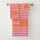 This bath towel set features a bold preppy stripe pattern in trending pink and orange hues. It is the perfect personalized addition to a modern dorm bathroom or a bright coastal home. You will love how the chunky retro typography makes your name pop against the vibrant geometric background. This set makes a thoughtful custom gift for bridesmaids, college students, or anyone who loves a punchy, colorful aesthetic.