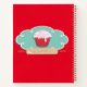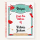 Cocina de recetas divertida y colorida retro de horneado y elementos de cocina. Presenta un delantal vintage, mezclador, cucharas de medida, manto de horno, recipiente de mezcla, espátula, cuchara de madera y alfiler con colores rojo, blanco y agua. Mano trazada por McBooboos