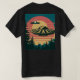 Esta es una camiseta retro Sunset Alien Spaceship Trees de hombres negros. Esta camiseta es una puesta de sol de estilo retro con un platillo volador que vuela a través de un cielo atardecer. Hay un OVNI con una órbita brillante en el cielo. En primer plano hay árboles de siempre verde. En la imagen hay colores de árbol verde azulados, rosas, amarillos, negros y verdes. La imagen está en la parte delantera y trasera de la camiseta.