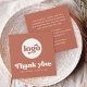 Tarjeta cuadrada de agradecimiento para empresas que incluye el texto "Gracias" en una fuente de estilo retro. Texto blanco (o color personalizado) sobre fondo marrón terracota. Carga tu logotipo en la parte delantera y añade texto personalizado en la parte posterior. Puede cambiar los colores, mover y redimensionar elementos con la herramienta de diseño.