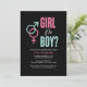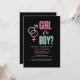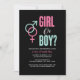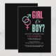 Este diseño presenta las palabras "¿chica o niño?" en rosa y azul junto a los símbolos para el niño y el chica, también en rosa y azul. Los detalles del fiesta se sientan debajo en blanco.