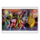 Elegant ,whimsical,artistic painting with magic colorful musical nocturne,moon,faeries,horses in vibrant blue green,red,yellow,white colors .Acrylic painting on canvas, mixed media painting with golden and silver foil .