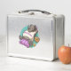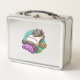 Una metalizado lonchera, con un rinoceronte en un lilo; un rinoceronte feliz que se enfría en un rosa brillante inflable en la piscina, con un pato de goma y una bebida refrescante en una bandeja flotante. Cambie el texto de la camiseta del rinoceronte por su nombre, mensaje o leyenda preferidos.