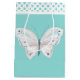 Bolsa de regalo de tamaño medio para personalizados de moda hecha en el huevo azul de robin, con gráficos de una mariposa blanca bonito, en la parte delantera y trasera, y banda de puntogramas de polka, alrededor de la parte superior. Personaliza el texto blanco, en la parte delantera del bolso, para leer lo que quieras. Hay una gran bolsa de regalo y papel de tejido a juego.