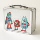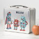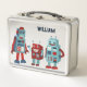 Añade un toque de ciencia ficción a tu almuerzo con esta lonchera personalizada. Cuenta con ilustraciones de tres bonitos robots de estilo retro en tonos azules y rojos y tiene un punto en la parte delantera para añadir un nombre con letras azul marino. Los gráficos aparecen tanto en la parte delantera como en la parte posterior de la lonchera.