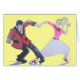 Bailarines de rock 'n' roll de los años 1950's, invitación a bailarinas de rock and roll de los años 1960. Un par de bailarinas de rock 'n' roll o jive. Una chica con falda de caniche, calcetines de bobby, zapatos de sillón, camiseta rosa, pañuelo y cinta en la cola de poni. Un chico de peluche con un corte de pelo de DA estrecha corbata negra camisa roja con cuello negro y guarnecido, pantalones negros. El espacio entre las dos bailarinas tiene forma de corazón.