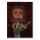 Imagen digital de una estrella de rock quemada creada a partir de un boceto de lápiz. El músico está tocando una guitarra verde y tiene pelo castaño y piel rosada. El personaje de la caricatura tiene grandes labios y círculos oscuros alrededor de sus ojos. El fondo es un rojo oscuro quemado con remolinos de negro y un sutil efecto de zoom.