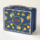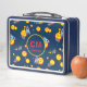 Adorable gift for any young school-age boy or girl who loves rocket ships and dreams of going on space travels. Done in a deep navy blue with yellow and red accents, along with the child's monogram and first name so their lunch box will never be mistaken as another child's.