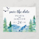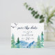 Esta Montaña Rocosa salva la postal de fecha anunciada es perfecta para un boda al aire libre. El diseño presenta un paisaje natural pintado de azul y verde con pinos acuarelas, pájaros y montañas.
