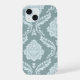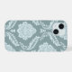 A vintage style decorative damask off-set surface pattern influenced by rococo classical design in duck egg blue color detail on a teal background.