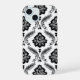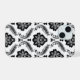 A vintage style decorative damask surface pattern influenced by rococo classical design in black and grey details on a white background.