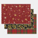 Tres hermosas láminas de papel de regalo, una es una purpurina roja con destellos y corazones de plata, una con cuadros de tartán rojos y verdes y un hermoso efecto de hoja de papel de oro sobre negro.