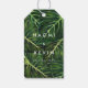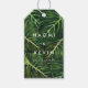 Un diseño audaz y fresco con hojas de palma pintadas y un borde dorado falso para un tema de verano y boda tropical.