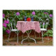 Ramo de rosa sobre una mesa vintage y sillas en el jardín de rododendros.