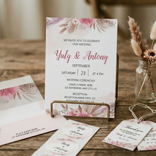 Elevate your wedding table decor with this elegant 4x9 menu. Featuring romantic champagne and rose florals with boho pampas grass. This long, slender format is perfect for placing on napkins or plates. Fully customizable with your selected courses and wedding details for a professional and cohesive look.