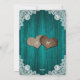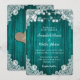 Verde azuladas invitaciones a bodas rústicas de moda inspiradas en encajes florales blancos y luces de cuerda sobre un fondo de madera. Perfecto diseño de tarjetas para invitar a sus invitados a su romántica fiesta de boda verde azulada rústica.