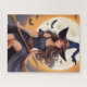 Rompecabezas. Una joven bruja alegre con el pelo largo montando un palo de escoba frente a una gran luna llena de brillo. Los murciélagos vuelan a su alrededor, sumando a la encantadora escena nocturna.