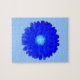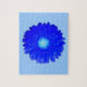 Este impresionante rompecabezas presenta una fotografía de una flor de marigold que ha sido manipulada para crear una hermosa flor azul oscuro con un centro azul brillante. La flor tiene un fondo azul pálido.