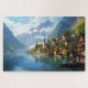 Rompecabezas con los encantadores lagos del pueblo en las montañas de los Alpes, ilustracion de fantasía.