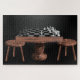 Rompecabezas con tablero de ajedrez, mesa y taburete.