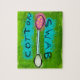 Un fondo verde limón rodea este divertido y colorido algodón swab, perfecto arte en el cuarto de baño para el hogar o la oficina. Los acentos rosa caliente, amarillo y azul con texto infantil garabateado completan la imagen.