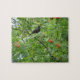 Este impresionante rompecabezas muestra una fotografía de un pájaro negro sentado en un árbol. Colgando del árbol hay grupos de bayas rojas brillantes. Esta foto fue tomada durante el verano.