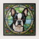 Rompecabezas de rompecabezas del perro del Boston Terrier hecho artísticamente en el modo de una ventana de vidrio falso manchado.