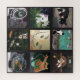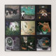 Agrupación de cuadros de gatos dispuestos en edredón. Nueve imágenes de diversión felina. Coloridas imágenes de gatos y otros animales, pescadores, vino, koi y más.