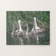Este impresionante rompecabezas presenta una hermosa fotografía de un par de cisnes adultos y sus 4 ciclones nadando a lo lejos a lo largo de un tranquilo río.