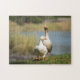 Rompecabezas caseros de dos gansos caminando por la hierba junto al río temprano en la mañana.