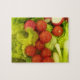Este impresionante rompecabezas presenta una fotografía de una mezcla de ingredientes de ensalada en un colador. La deliciosa foto incluye tomates, rábanos, cebollas de primavera y lechugas.