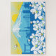 El monte Fuji en el fondo, el horizonte de Tokio en el medio, y un florecimiento de flores de cerezo al que asisten abejas ocupadas en primer plano -todo creado en tonos azules, amarillos, negros, blancos y grises.