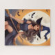 Rompecabezas de una jovencita y alegre bruja con el pelo largo corriendo montando un palo de escoba frente a una gran luna llena de brillo. Los murciélagos vuelan a su alrededor, sumando a la encantadora escena nocturna.