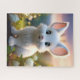 Rompecabezas. Un bonito conejo blanco con grandes ojos azules y piel esponjosa se sienta entre flores blancas y follaje verde, con una suave puesta de sol al fondo. La escena evoca una sensación de calidez y serenidad.