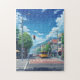 Disfruta de una experiencia de rompecabezas relajante con este rompecabezas de una calle de la ciudad al estilo anime. La obra de arte presenta un día soleado de verano en un pueblo tranquilo, con un colorido autobús urbano esperando en el semáforo, bicicletas a lo largo de la acera y edificios acogedores que bordean la calle.
